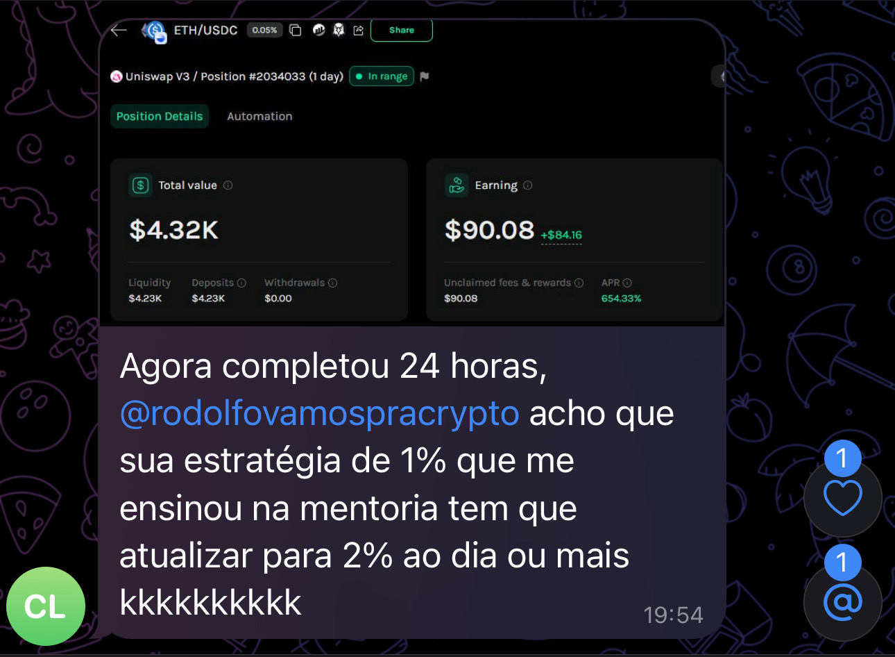 Na Mentoria 1% DeFi, eu compartilho o que aplico pessoalmente toda semana no universo da finanças descentralizadas com os maiores projetos cripto do mundo!
